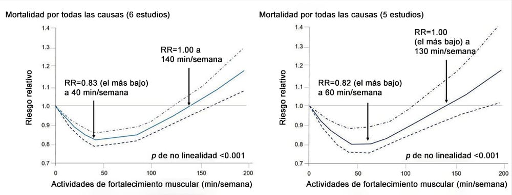 Los gráficos anteriores, que provienen del metaanálisis de James O'Keefe,13 muestran la curva de la relación dosis-respuesta entre el entrenamiento de fuerza y la mortalidad por todas las causas. Como puede ver, los mayores beneficios se obtienen cuando entrena de 40 a 60 minutos por semana. No es provechoso hacer más que eso.