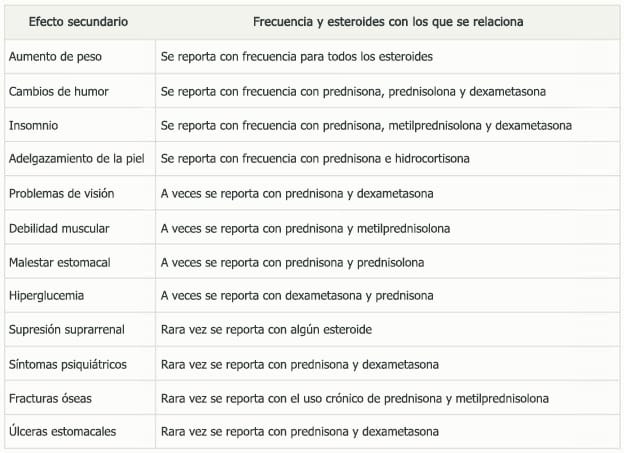 Como era de esperarse, los efectos secundarios de los esteroides son similares a los que se observan con el exceso de cortisol, aunque en muchos casos son mucho más graves.